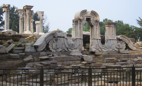 El fastuoso complejo residencial de la dinastía Qing conocido también como Yuan Ming Yuan por estar construido entre exuberantes jardines –Jardines de Perfecto Brillo-, fue saqueado y finalmente demolido por las tropas británicas y francesas durante la Segunda Guerra del Opio. Hoy es un lugar turístico muy visitado.