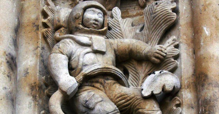 En la esquina de la Catedral Nueva de Salamanca si tienes buena visión puedes encontrar la famosa figura del astronauta. Su historia comienza en 1992 cuando la “Puerta de Ramos”, que estaba muy dañada, debe restaurarse. Pues al mampostero Miguel Romero, siguiendo la tradición de las restauraciones de las catedrales que incluyan un referente al año de su mejora (ese año se inauguró la exposición temporal “Las Edades del Hombre”), esculpió un hombre del espacio. Pero también un dragón con un cono de helado, un lince y una cigüeña.